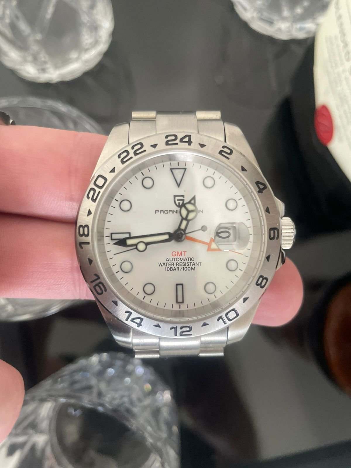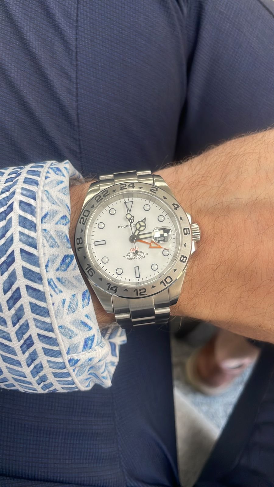 Equipado com movimento mecânico automático e corda manual, o relógio funciona sem bateria, sendo alimentado pelo movimento do seu pulso ou pelo ajuste manual da coroa. A função GMT permite acompanhar múltiplos fusos horários, ideal para viajantes, empresários e quem se conecta com o mundo inteiro.
